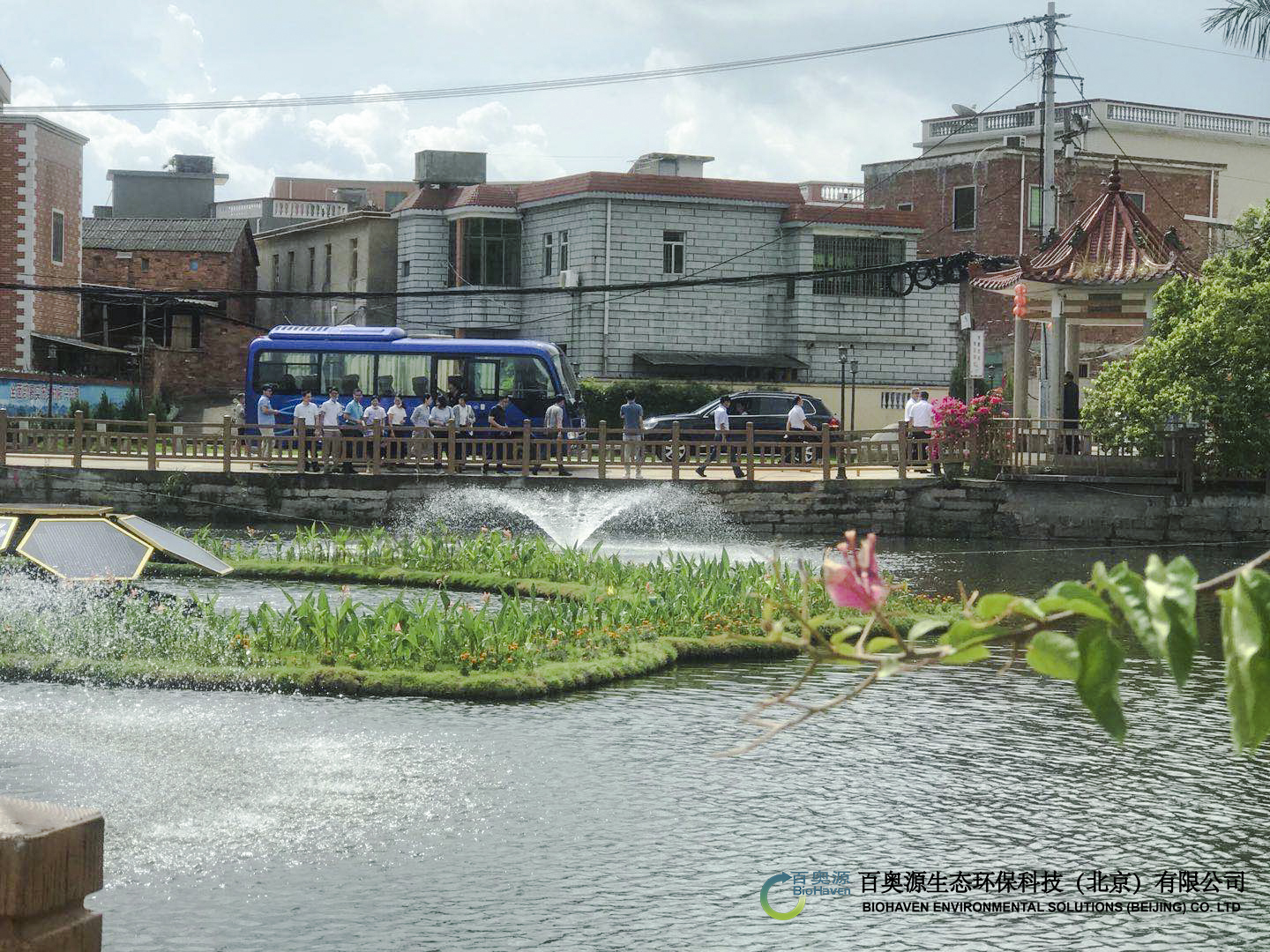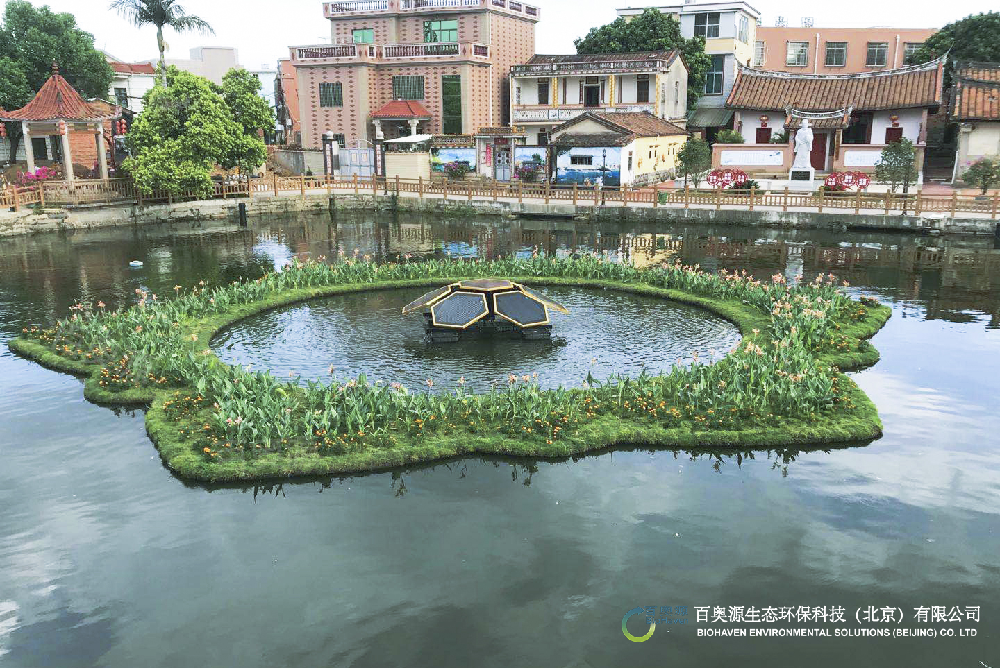 漳州角美鎮(zhèn)埔尾村祠堂大塘為白石林先生祠、進(jìn)士牌及傳統(tǒng)民居等古建筑環(huán)繞,是埔尾村重要的水景觀節(jié)點,更是漳州臺商投資區(qū)廉政教育基地及埔尾村鄉(xiāng)賢鄉(xiāng)訓(xùn)館的主要配套景點。埔尾村扎實推進(jìn)鄉(xiāng)村振興戰(zhàn)略,在實施農(nóng)村污水收集處理工程的基礎(chǔ)上,結(jié)合截污納管、補(bǔ)水措施等工程,創(chuàng)新采用的浮動凈水廠技術(shù),以生態(tài)手段同步實現(xiàn)水質(zhì)改善與景觀提升,打造大塘優(yōu)美水環(huán)境的目標(biāo),并與埔尾村古建筑景觀互映互襯,彰顯千年古村落的獨有生態(tài)之美。