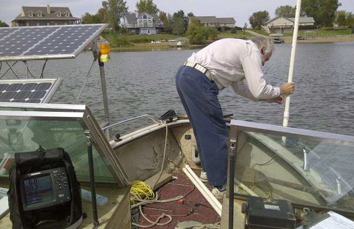 位于美國(guó)南達(dá)科他州Harbor Bay的Madison湖長(zhǎng)期接收周圍農(nóng)業(yè)面源污染、地表徑流和市政污水的污染物入湖,湖底堆積的底泥常年向水中釋放污染物,導(dǎo)致湖體水質(zhì)富營(yíng)養(yǎng)化嚴(yán)重 。2012年6月初由于干旱湖水水面下降,藍(lán)藻大規(guī)模爆發(fā)。根據(jù)該項(xiàng)目現(xiàn)場(chǎng)踏勘及底泥調(diào)查結(jié)果,設(shè)計(jì)將三臺(tái)奧科?太陽(yáng)能循環(huán)復(fù)氧設(shè)備以三角形點(diǎn)位布設(shè)。