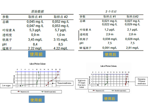 太陽能水循環(huán)復(fù)氧設(shè)備使水體在水平方向、垂直方向造成循環(huán)流,增加了水體的流動性,將藻類由水面循環(huán)到水底,打破了藻類在水體表層的強光照、高溫度、低流速的優(yōu)勢生長繁殖環(huán)境,有效控制藻類生長,減少水體異味產(chǎn)生。湖泊夏季表層水溫高,湖底與表層溫差較大,在湖面水下4 米左右會形成溫度變化較大的躍溫層。一方面湖泊表層水溫較高,為藻類生長提供了適宜的溫度與光照環(huán)境,在營養(yǎng)物質(zhì)豐富、溫度適宜的表層水體中,藻類會大量繁殖,最終暴發(fā)形成水華,另一方面水生生物受到水溫分層的影響,生息空間受到較大限制。太陽能水循環(huán)復(fù)氧設(shè)備能夠有效作用到水面4 米以下的空間,促使均溫層、躍溫層水體有效流動與混合,不但能在縱向形成水體交換消除水溫分層的不利影響,也能使營養(yǎng)鹽、溶解氧在作用范圍內(nèi)有效混合達到營養(yǎng)鹽濃度降低,溶解氧升高的效果。